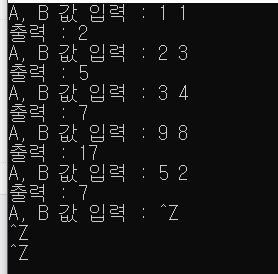 테스트 케이스의 횟수가 주어져있지 않고 종료 조건이 없기 때문에 입력을 받을때 EOF(End Of File)이 주어지면 종료되게 만듭니다. EOF의 값은 -1로 정의되고 테스트상에서는 Ctrl + z로 사용가능합니다.
